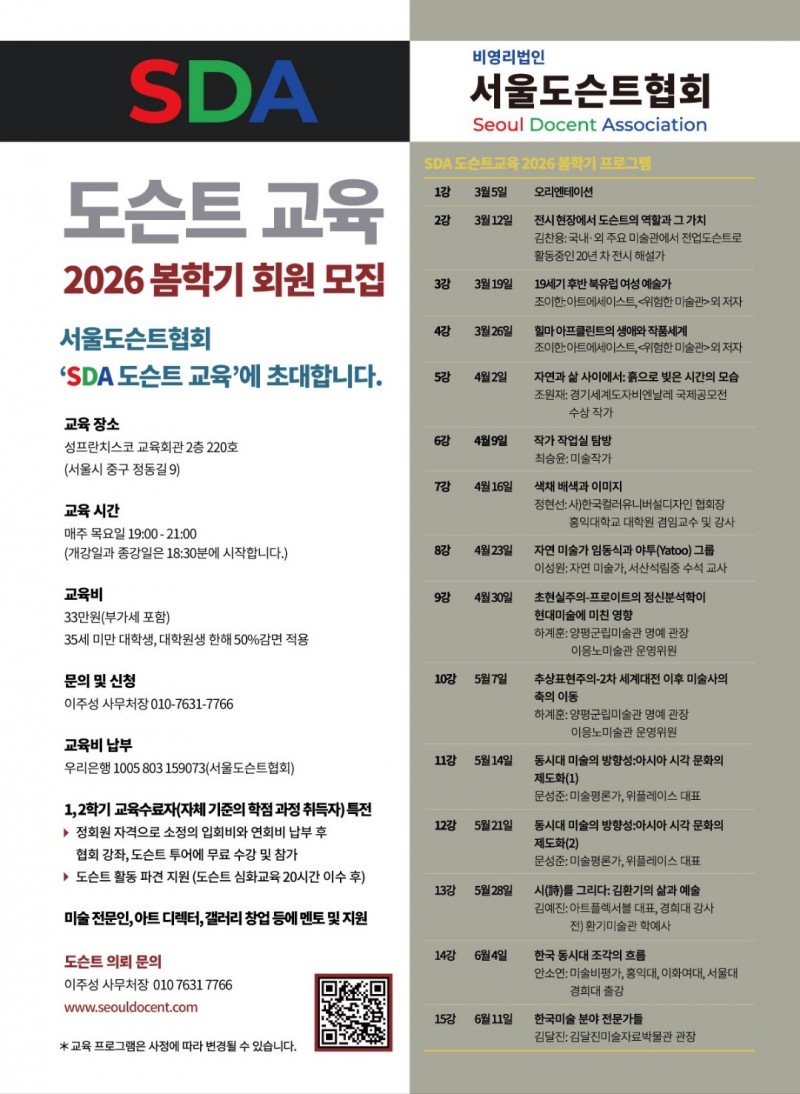 2026년 봄학기 교육 프로그램 (도슨트 교육생 모집) 페이지 정보 작성자 SDA 댓글 0건 조회 332회 작성일 26-02-08 17:30 본문 목록 이전글SDA 서울도슨트협회 창립대회: 2016.5.2. 19.04.12 다음글2023 봄학기 SDA도슨트교육 실시 23.01.18 댓글목록 댓글목록 등록된 댓글이 없습니다.